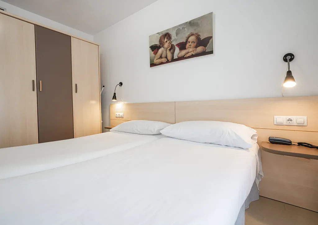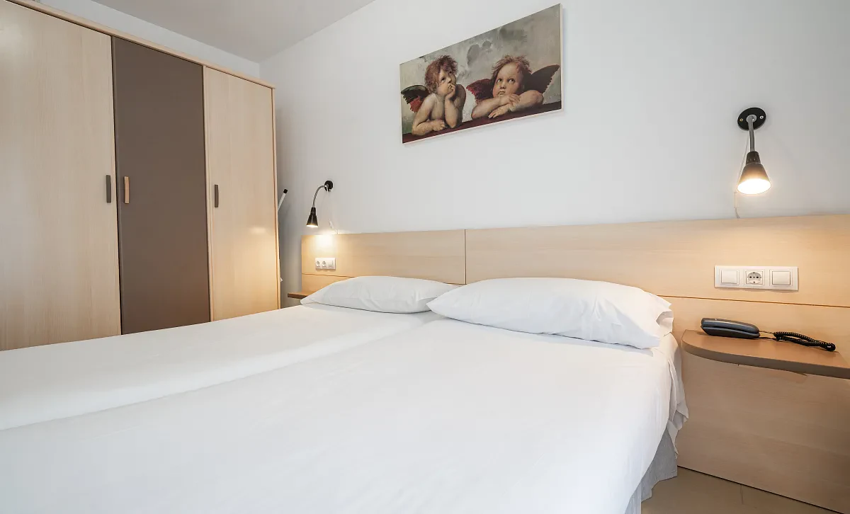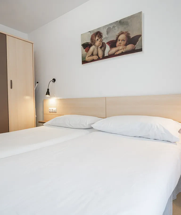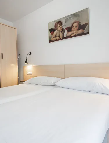 Our two-bedroom apartment with a balcony is specially designed for a memorable holiday. It features two double bedrooms, each with a queen bed, a bathroom, and a spacious living room with a sofa bed for two and a fully equipped kitchenette. There's also a balcony with a small table and two chairs, perfect for enjoying the fresh air. You can access it from both the living room and the bedroom.